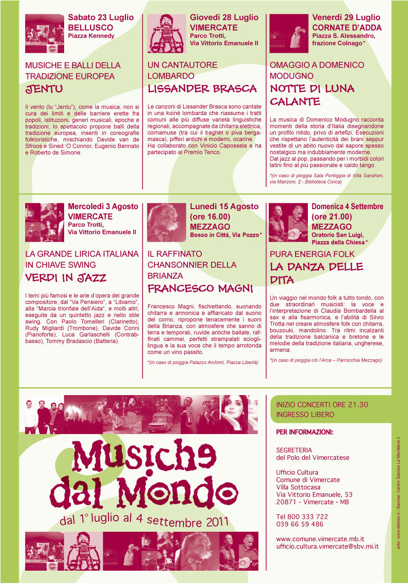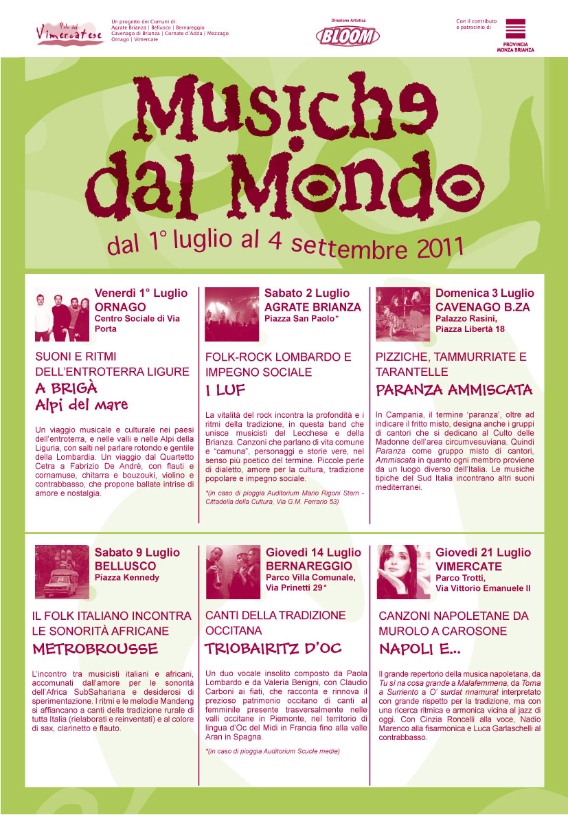 Dodici le serate, tra il primo luglio e il 4 settembre, che quest'anno vedranno coinvolti otto comuni del vimercatese (Agrate Brianza, Bellusco, Bernareggio, Cavenago Brianza, Cornate d'Adda, Mezzago, Ornago,Vimercate) e durante le quali si esibiranno artisti nell'ambito della musica folk italiana.